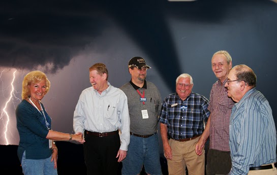 Neither lightning nor tornado can stop these two new hams, pictured here with the usual suspects. Please welcome Bob Doherty KM4BAO next to Peggy, and Glen “SPARKS” Goodale KM4BAP to the left of Chet.