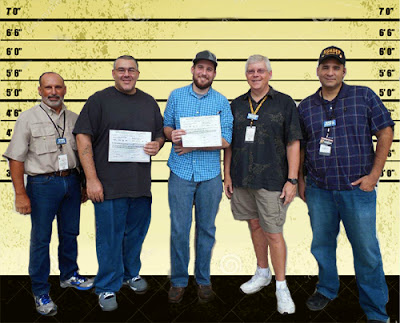 Randy Wildman, AD4RW; Louis Pacheco, KK4TSH, general (dark T-shirt); Austin Kline, KM4DNB, technician, (plaid shirt); Richard Grubb, W8DUK; Ringo Breton, KG4DUF