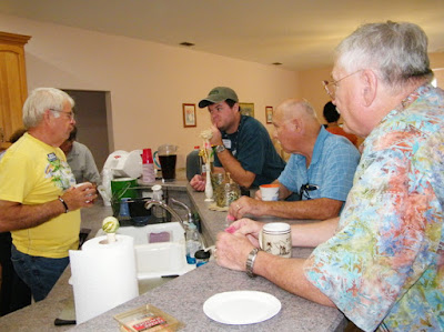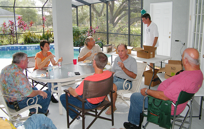 Attendees discuss radio before the meeting. Left to right, Buddy, Matthew, John, and Rich. Bill, not shown, was taking the picture.