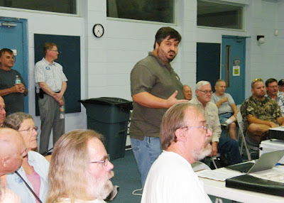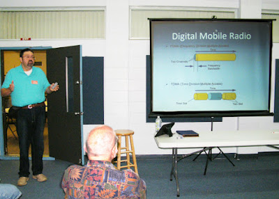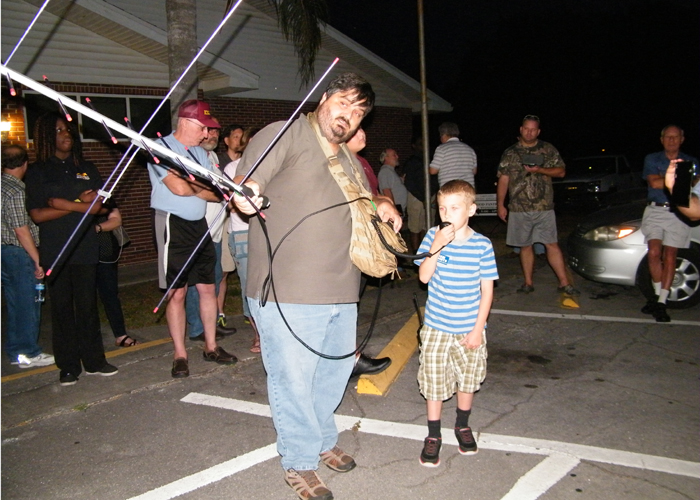 Speaking to a captivated audience, Drew presented the the history and theory behind satellite communication. Later the group retired to the outdoors where he put theory into practice. In the space of a few minutes he made a contact with a ham in Texas.Then, wishing to share the fun Drew got Liam KM4STS to participate.