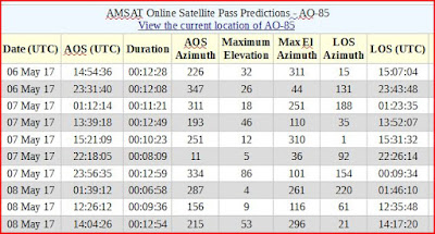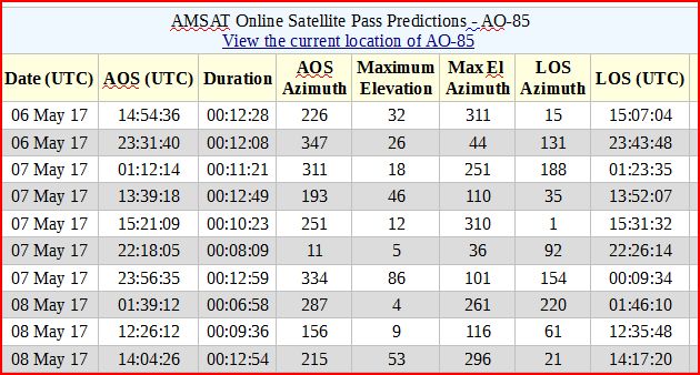 So on May 6, at 14:54:36 AO-85 just popped over the horizon for someone living in Lakeland. The direction was 226 degrees from North. After about 5 minutes the satellite reached a height of 32 degrees above the horizon at a direction of 311 degrees from North. Finally, the satellite disappeared over the horizon about five minutes later at a direction 15 degrees from North.