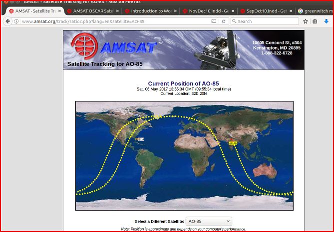 Finally, by clicking on View the current location of AO-85 you can get a plot of where it is and where it is expected to be in the near future.