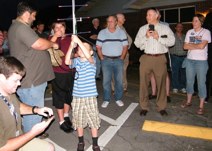 Speaking to a captivated audience, Drew presented the the history and theory behind satellite communication. Later the group retired to the outdoors where he put theory into practice. In the space of a few minutes he made a contact with a ham in Texas.Then, wishing to share the fun Drew got Liam KM4STS to participate.