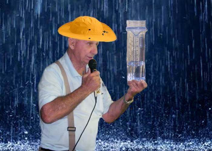 Singing in the rain Don (“Kelly”) demonstrates how to read a rain gauge. Hat is optional. ๐